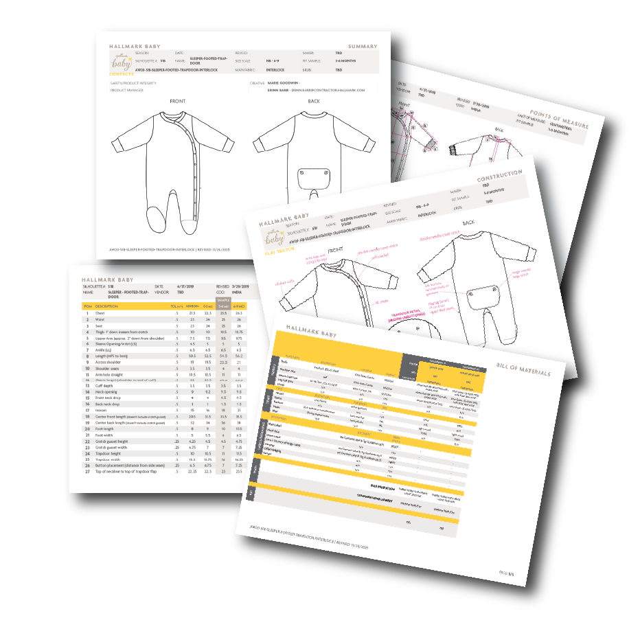 Tech packs include: Sketches, Construction Specifications, Size Chart/Points of Measurement, Artwork Specifications, Bill of Materials, and Sample Tracking/Fit Comments.