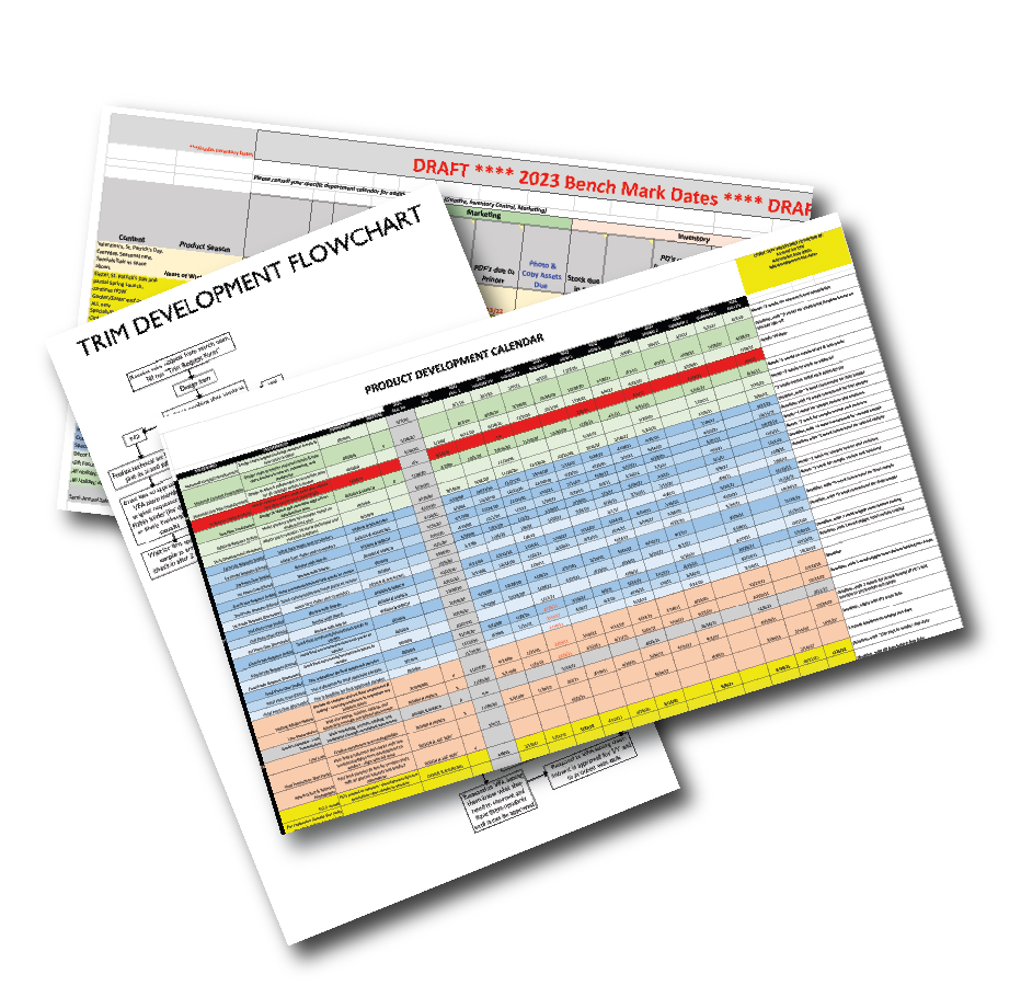Just some of the things I love: Sample Tracking Charts, Product Design & Development Calendars, Design & PD Task Flow Charts, etc.
